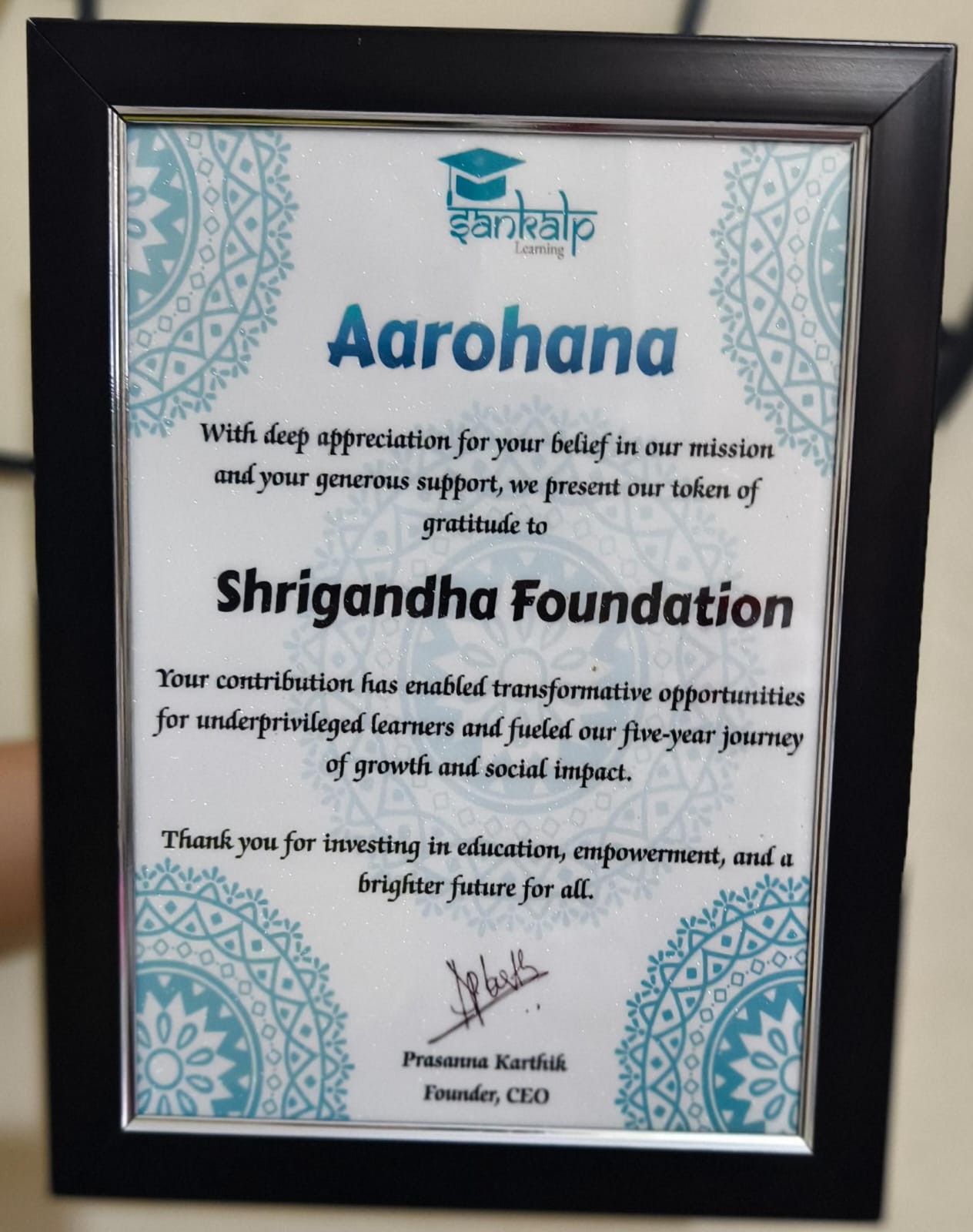 Shrigandha Foundation is delighted to receive appreciation from Sankalp Learning for our support in the field of education on this ocassion.